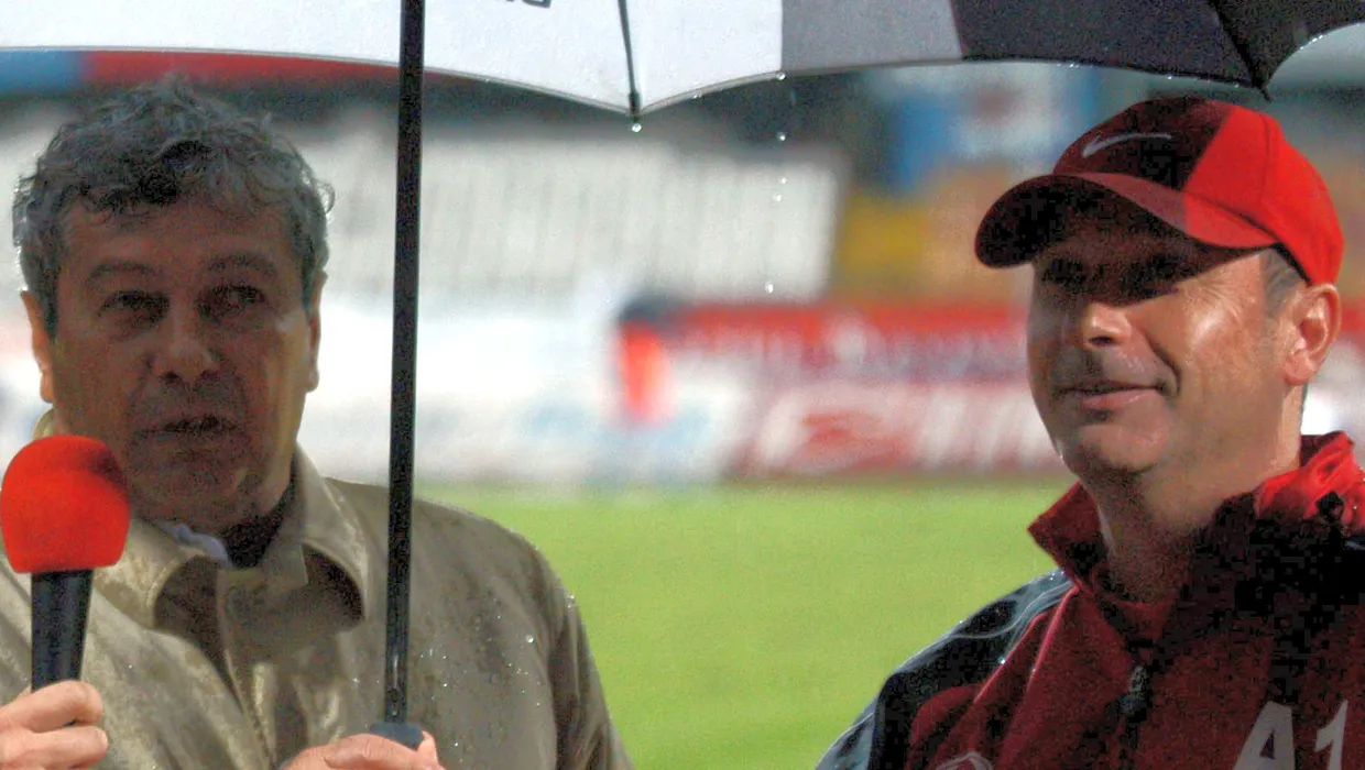 Mircea Lucescu (antrenor Sahtior Donetk) si Mircea Rednic (antrenor Dinamo) stau sub o umbrela.