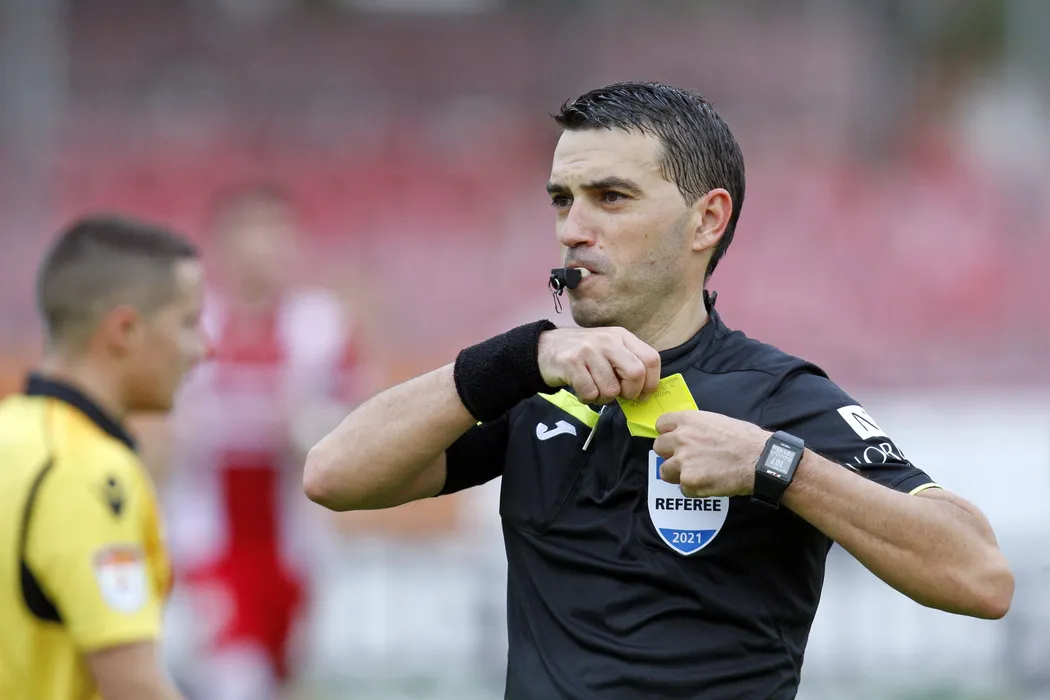 Arbitrul Ovidiu Hategan conduce de la centru partida dintre Dinamo, si FC Voluntari, partida disputata in etapa 4 a play-out-ului Ligii 1 la fotbal, joi, 29 aprilie 2021, la Bucuresti. SPORTS PICTURES / MEDIAFAX FOTO