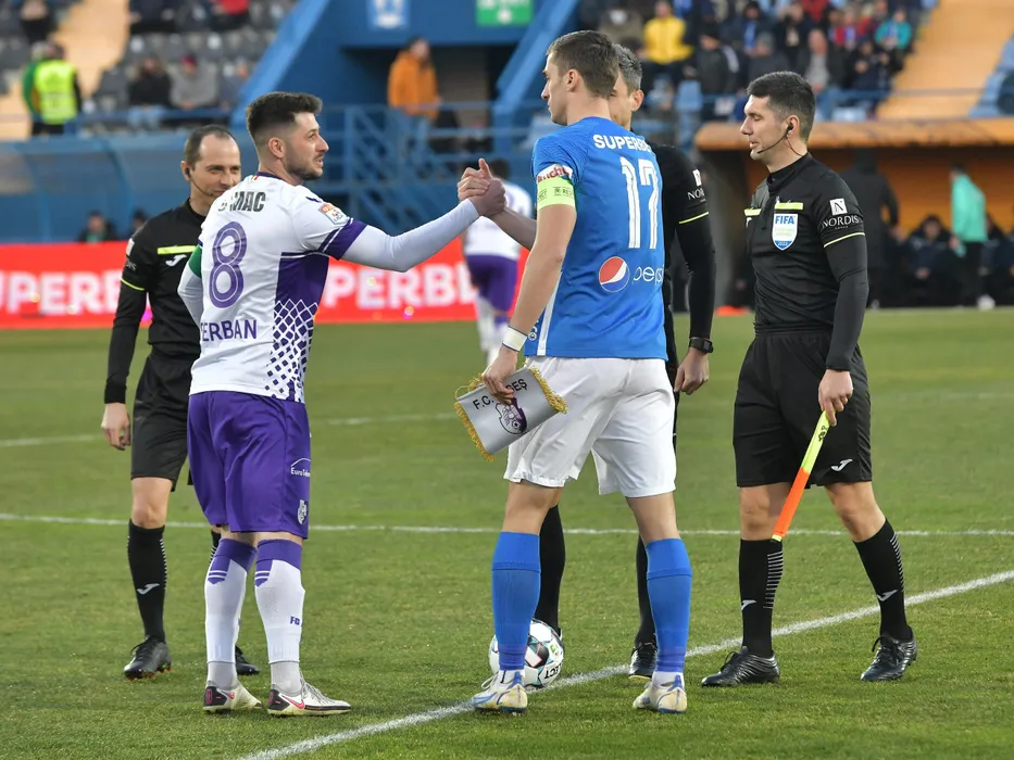 Cei doi capitani Ionut Adrian Serban si Ionut Justinian Larie se saluta inaintea meciului de fotbal dintre Farul Constanta si FC Arges, contand pentru Liga 1 Casa Pariurilor, desfasurat pe Stadionul central al Academiei Gheorghe Hagi din Ovidiu, luni 21 februarie 2022. © FOTO:Razvan Pasarica/SPORT PICTURES
