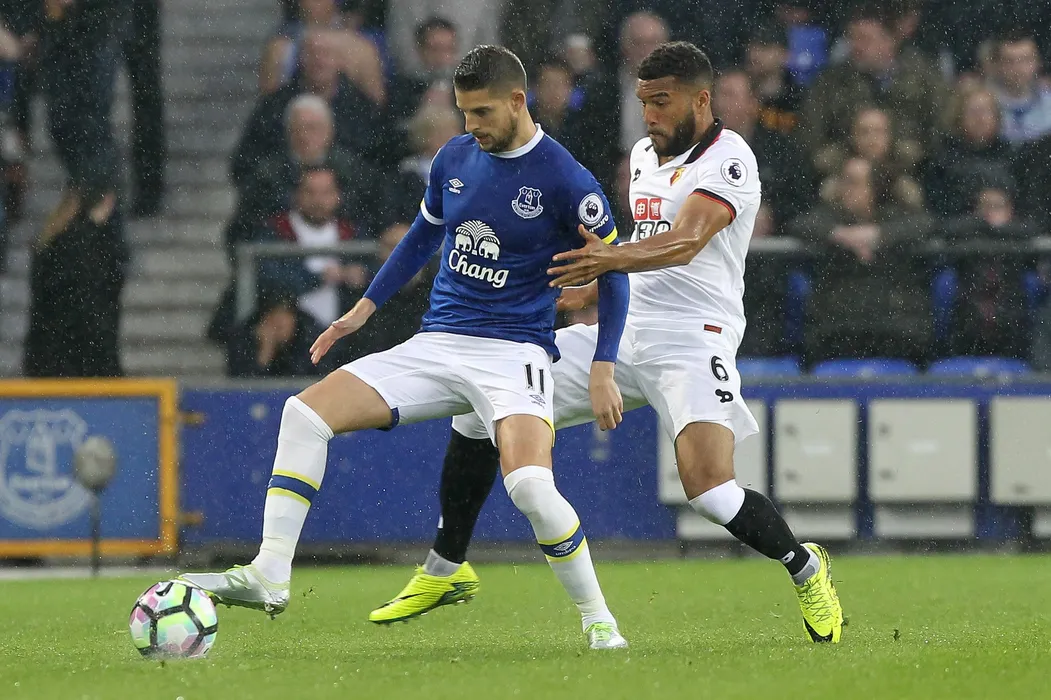 Kevin Mirallas of Everton is tackled by Adrian Mariappa of Watford during the Premier League match between Everton and Watford at Goodison Park on May 12th 2017 in Liverpool, England. (Photo by Tony Taylor/phcimages.com),Image: 332117762, License: Rights-managed, Restrictions: No unpaid use. All rights reserved. Self-billing applies where appropriate. No syndication. No redistribution. Editorial use only. Maximum 45 images during a match. No video emulation or promotion as 'live'. No use in games, competitions, merchandise, betting or single club/player servies. No use with unofficial audio, video, data, fixtures or club/league logos.