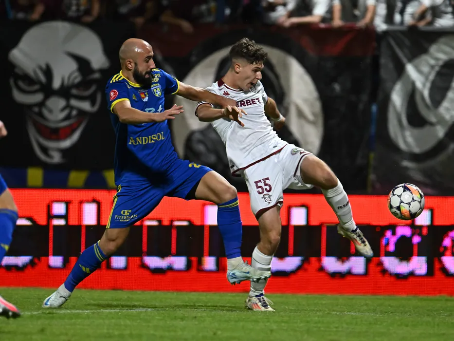 Rareș Mihai Pop marchează un gol de lângă Daniel Marius Serbanica in meciul dintre Unirea Slobozia si Rapid Bucuresti, contand pentru Superliga Superbet, desfasurat pe Clinceni Arena din Clinceni, luni 23 septembrie 2024. © FOTO:Razvan Pasarica/SPORT PICTURES