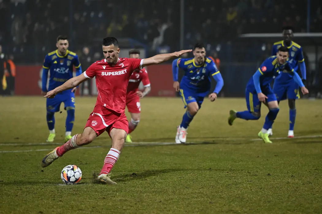 Selmani Astrit marchează un gol din penalty in meciul de fotbal dintre Unirea Slobozia si Dinamo Bucuresti, din cadrul Superligii Superbet, desfasurat pe Clinceni Arena din Clinceni, vineri 31 ianuarie 2025. © FOTO:Razvan Pasarica/SPORT PICTURES
