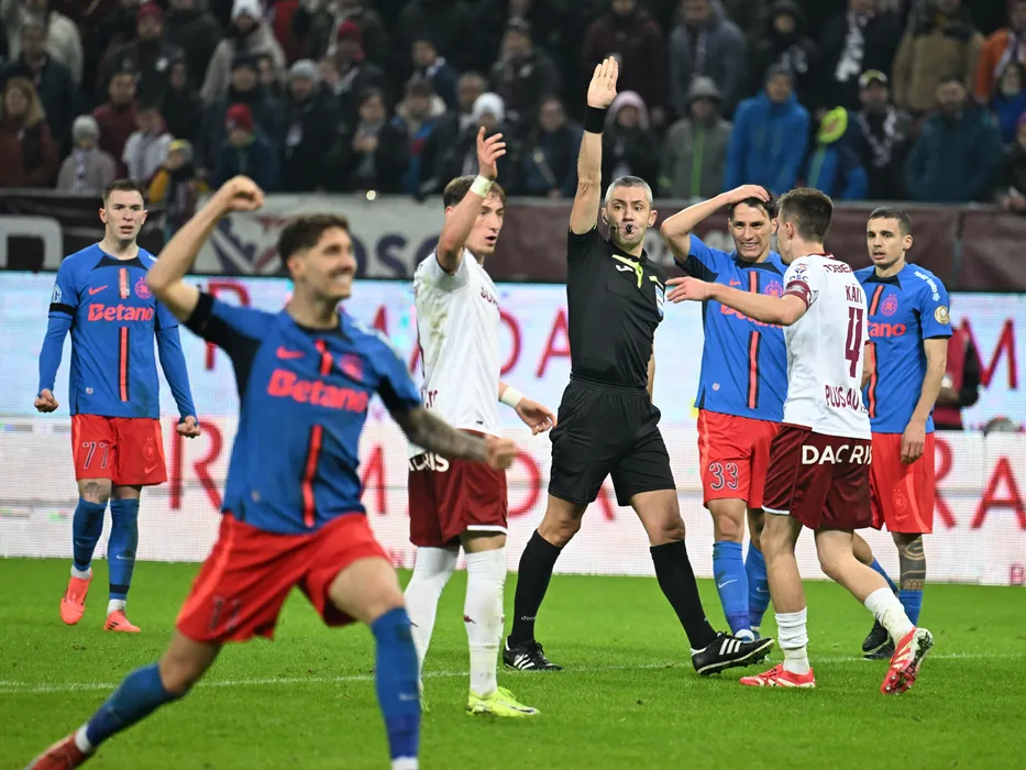 Arbitrul central Radu Petrescu reactioneaza alaturi de Risto Radunovic, Mattias Kait si Juri Cisotti in meciul de fotbal dintre Rapid Bucuresti si FCSB, din cadrul Superligii Superbet, desfasurat pe Arena Nationala din Bucuresti, duminica 2 martie 2025. © FOTO:Razvan Pasarica/SPORT PICTURES