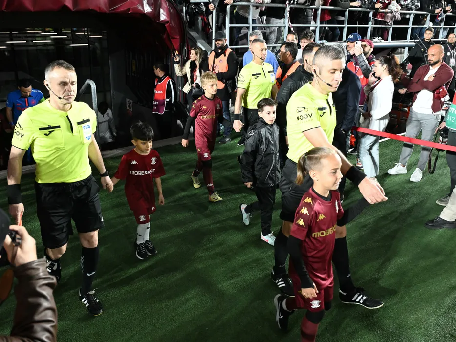 Brigada de arbitri formată din Vasile Marinescu, Radu Petrescu si Ovidiu Artene la meciul de fotbal dintre Rapid Bucuresti si FCSB, din cadrul Play off-ului Superligii Superbet, desfasurat pe Superbet Arena Giulesti din Bucuresti, luni 27 aprilie 2025. © FOTO:Razvan Pasarica/SPORT PICTURES