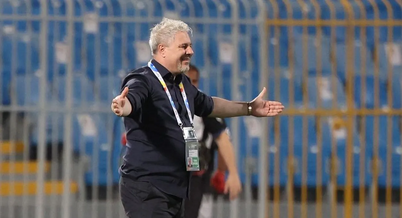 Shabab's Romanian coach Marius Sumudica reacts during the AFC Champions League group B match between Saudi Arabia's Al-Shabab and Iraq's Al-Quwa Al-Jawiya on April 18, 2022, at the Prince Faisal Bin Fahd stadium in the capital Riyadh.,Image: 684079247, License: Rights-managed, Restrictions: , Model Release: no