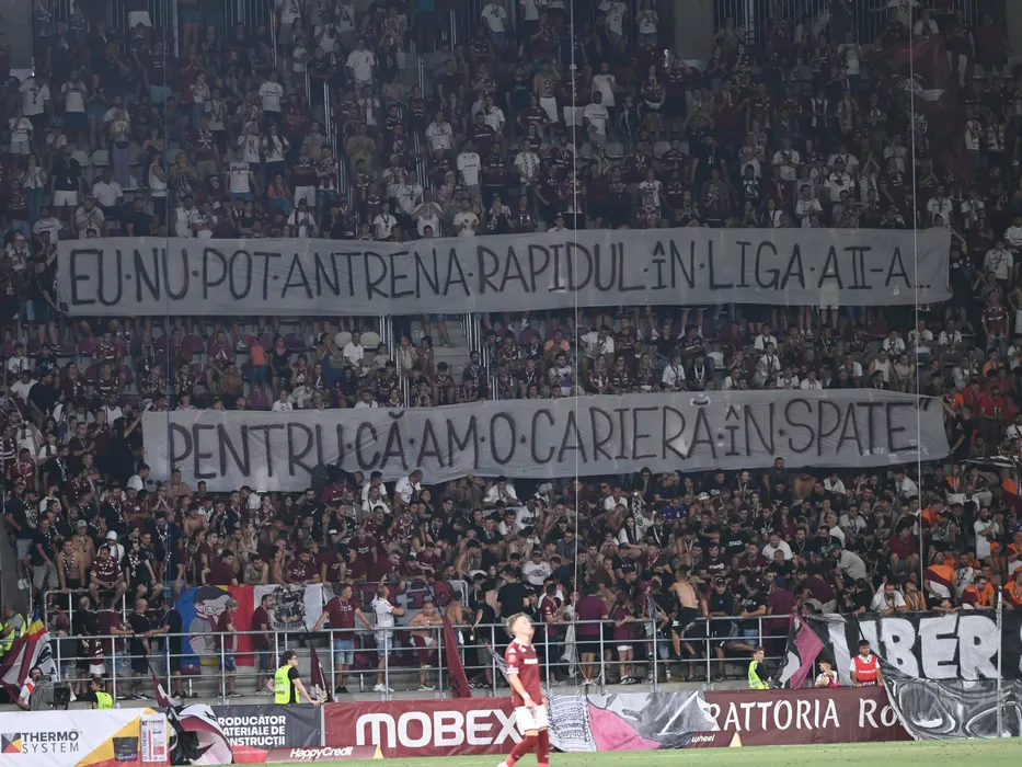 Declaratie a lui Marius Sumudica afisata in peluza de galeria rapidista la meciul de fotbal dintre Rapid Bucuresti si Dinamo Bucuresti, din cadrul Superligii Superbet, desfasurat pe Superbet Arena-Giulesti din Bucuresti, duminica 18 august 2024. © FOTO:Razvan Pasarica/SPORT PICTURES