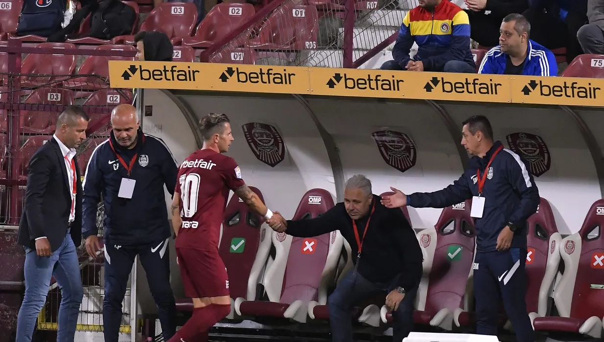 Cristian Panin, Marius Sumudica si Gabriel Margarit il saluta pe Ciprian Ioan Deac la iesirea din teren la meciul de fotbal dintre CFR Cluj si Steaua Rosie Belgrad, contand pentru Play-off-ul UEFA Europa League, desfasurat pe Stadionul Dr. Constantin Radulescu din Cluj Napoca, joi 26 august 2021. © FOTO:Razvan Pasarica/SPORT PICTURES