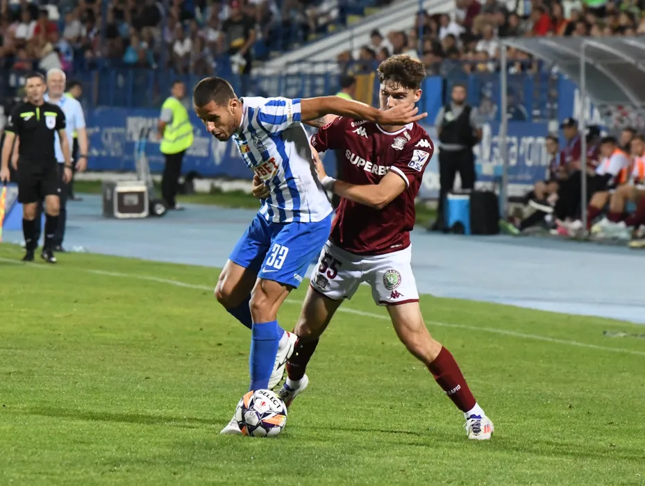 David Atanaskoski și Rareș Mihai Pop în meciul de fotbal dintre Poli Iași si FC Rapid 1923 București, contând pentru SuperLiga Superbet, desfășurat pe Stadionul Emil Alexandrescu din Iași, vineri 23 august 2024. © FOTO: Tudi/SPORT PICTURES