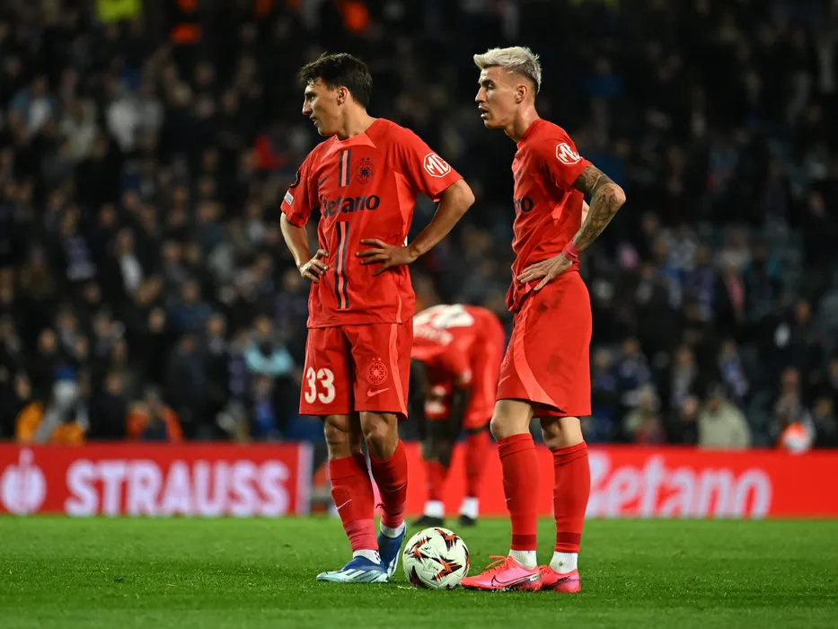 Fotbaliștii steliști Risto Radunovic si Octavian George Popescu in meciul de fotbal dintre Glasgow Rangers si FCSB, din cadrul UEFA Europa League, desfasurat pe Stadionul Ibrox Park din Glasgow, joi 24 octombrie 2024. © FOTO:Razvan Pasarica/SPORT PICTURES