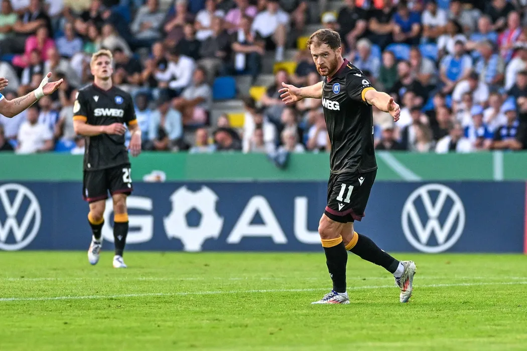 DFB Pokal - Sportfreunde Lotte - Karlsruher SC am 18.08.2024 i Stadion am Lotter Kreuz in Lotte Jubel, Torjubel, Torschuetze, Torschütze Budu Zivzivadze Karlsruhe jubelt nach seinem Tor zum 0:4. *** DFB Pokal Sportfreunde Lotte Karlsruher SC on 18 08 2024 i Stadion am Lotter Kreuz in Lotte Cheering, goal celebration, goal scorer, goal scorer Budu Zivzivadze Karlsruhe cheers after his goal to 0 4 MT,Image: 899776523, License: Rights-managed, Restrictions: , Model Release: no