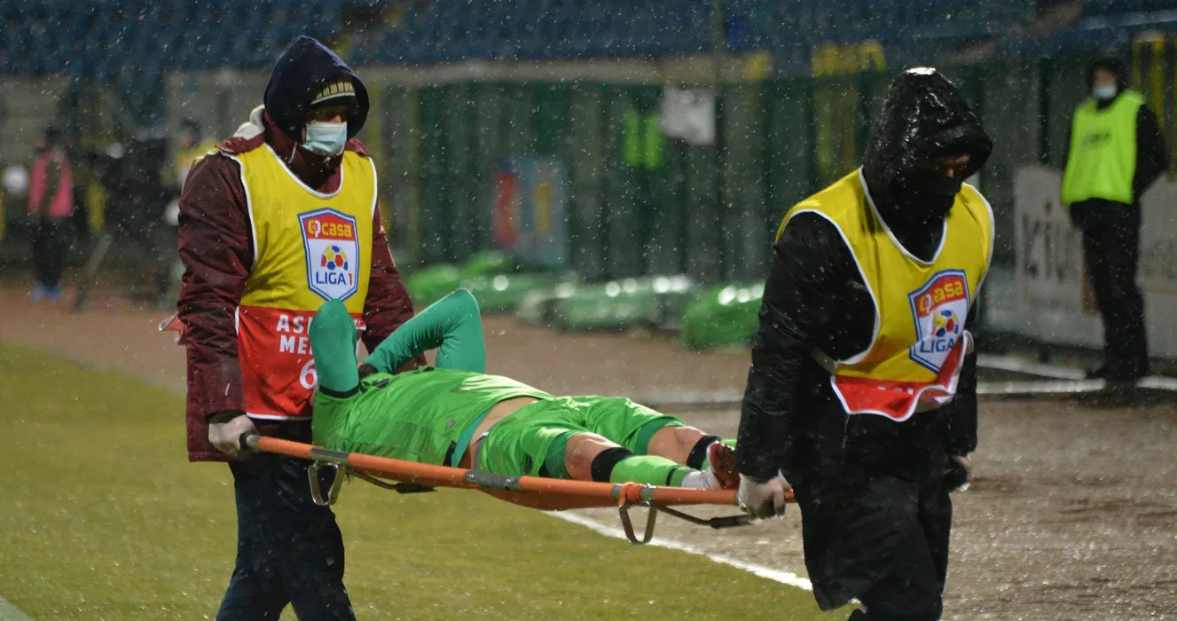 Marius Ionut Tomozei iese accidentat in meciul de fotbal dintre FC Botosani si Dinamo Bucuresti, contand pentru Liga 1 Casa Pariurilor, desfasurat pe Stadionul Municipal din Botosani, luni 07 februarie 2022. © FOTO:Ionut Tabultoc/SPORT PICTURES