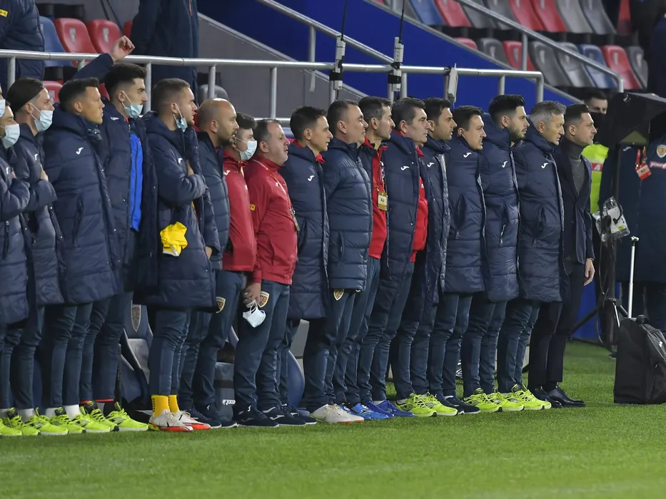 Banca Romaniei cu Mirel Radoi, Florin Constantinovici si Nicolae Dica in meciul de fotbal dintre Romania si Islanda, din cadrul Preliminariilor Campionatului Mondial 2022, desfasurat pe Stadionul Steaua din Bucuresti, joi 11 noiembrie 2021. © FOTO:Razvan Pasarica/SPORT PICTURES