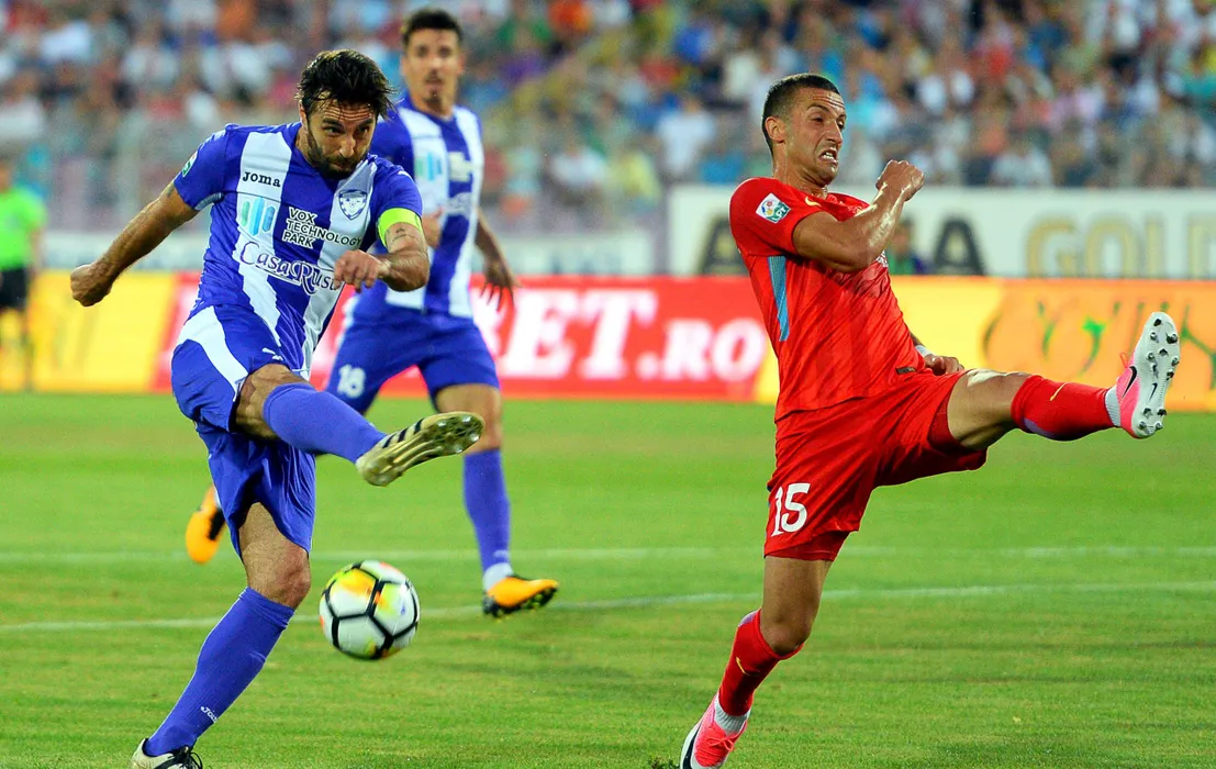 Gabriel Canu si Marko Momcilovic in meciul de fotbal dintre ACS Politehnica Timisoara si FCSB, desfasurat vineri 21 iulie 2017 pe stadionul Dan Paltinisanu din Timisoara in cadrul Ligii 1 Betano.Leczki Jozsi/SPORT PICTURES