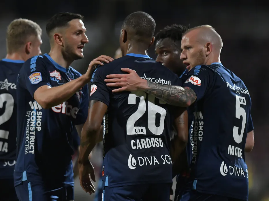 Bucurie a fotbalistilor aradeni dupa un gol marcat cu Marko Vukcevic, Nicolao Manuel Dumitru Cardoso si Modestas Vorobjovas in meciul de fotbal dintre Dinamo Bucuresti si UTA Arad, contand pentru Play-out-ul Ligii 1 Casa Pariurilor, desfasurat pe Stadionul Dinamo din Bucuresti, vineri 13 mai 2022. © FOTO:Razvan Pasarica/SPORT PICTURES