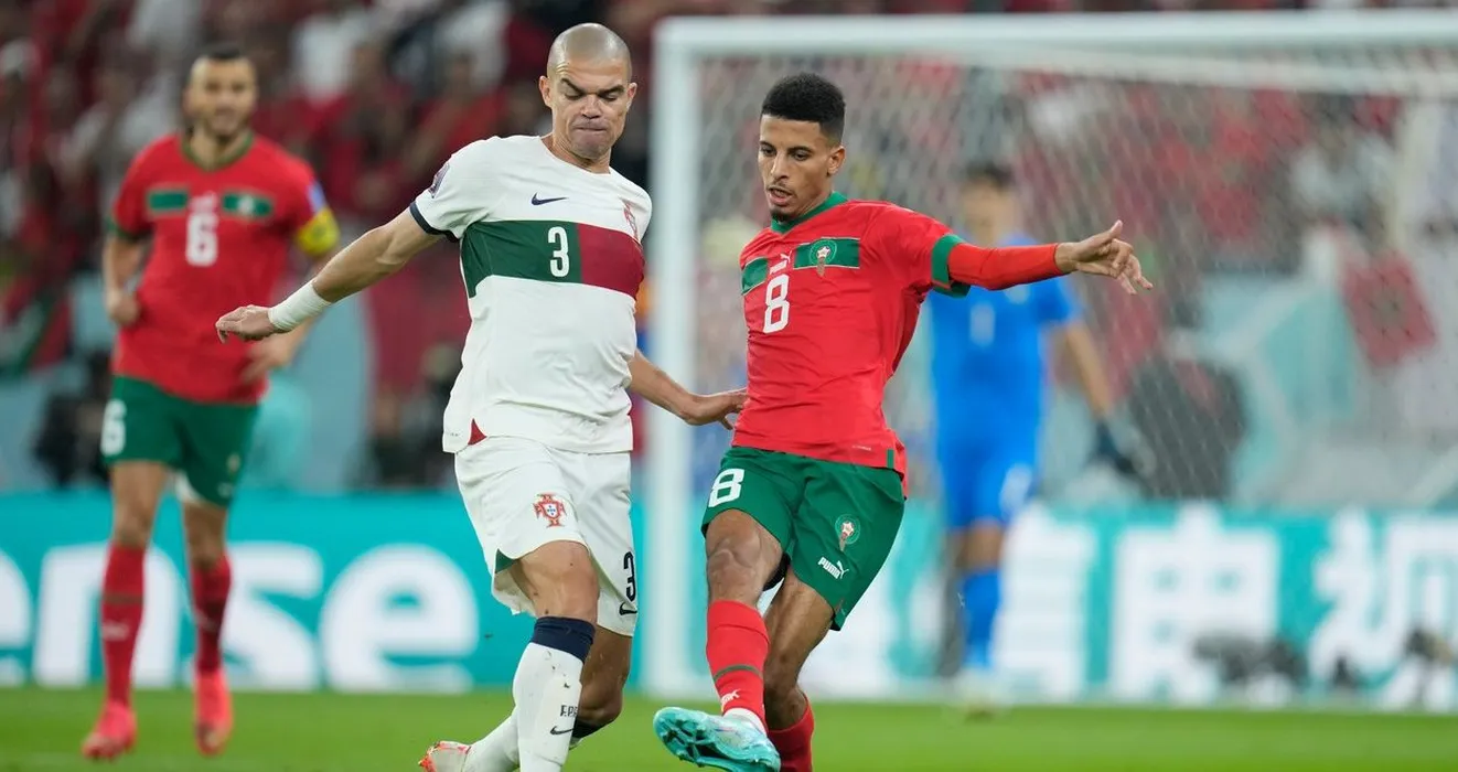 Portugal's Pepe, left, fights for the ball against Morocco's Azzedine Ounahi during the World Cup quarterfinal soccer match between Morocco and Portugal, at Al Thumama Stadium in Doha, Qatar, Saturday, Dec. 10, 2022.,Image: 743773633, License: Rights-managed, Restrictions: This content is intended for editorial use only. For other uses, additional clearances may be required., Model Release: no, Pictured: A. Ounahi,Pepe