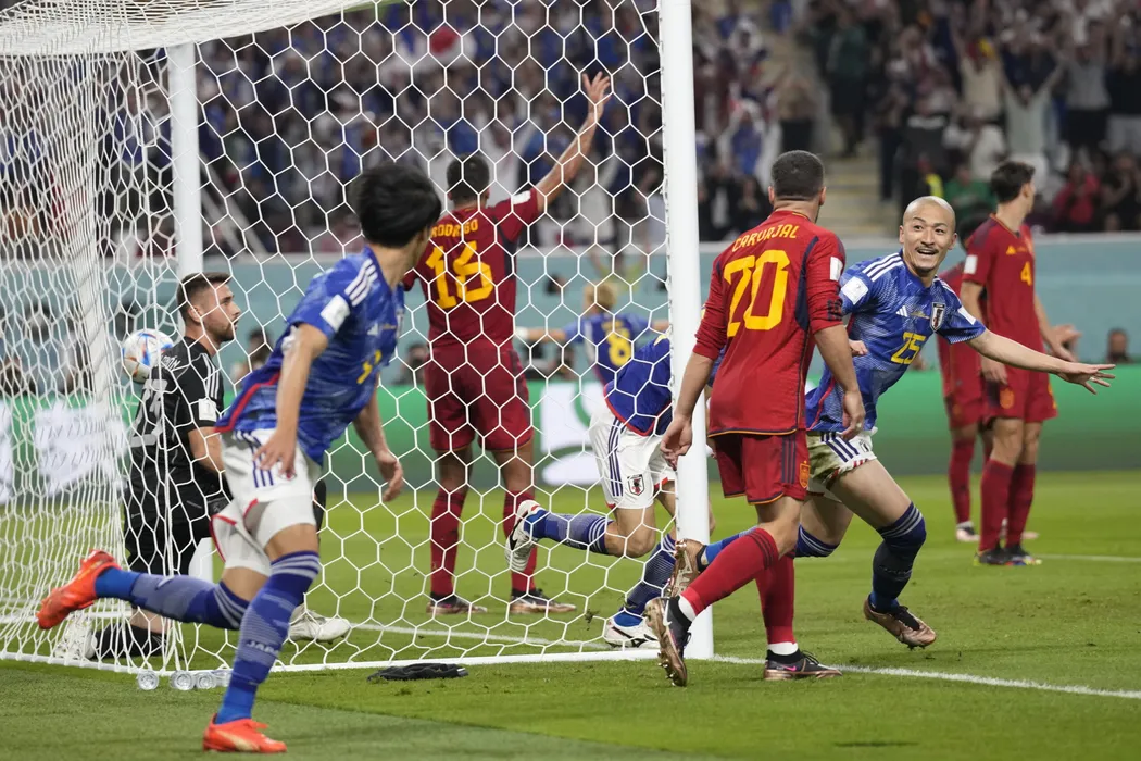 Japan's Daizen Maeda, right, and teammate Kaoru Mitoma, left, celebrate after Ao Tanaka scored their side's second goal against Spain during a World Cup group E soccer match at the Khalifa International Stadium in Doha, Qatar, Thursday, Dec. 1, 2022. (AP Photo/Eugene Hoshiko)
