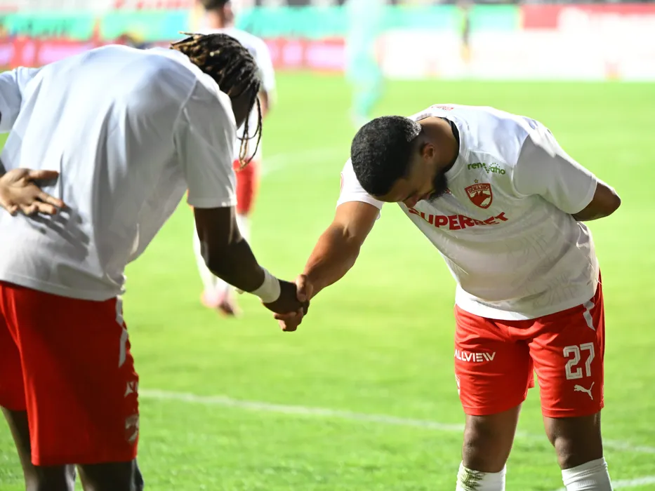 Mamoudou Karamoko îl felicită pe Maxime James Sivis dupa un gol marcat in meciul dintre Petrolul Ploiesti si Dinamo Bucuresti, contand pentru Superliga Superbet, desfasurat pe Stadionul Ilie Oana din Ploiesti, luni 15 septembrie 2025. © FOTO:Razvan Pasarica/SPORT PICTURES