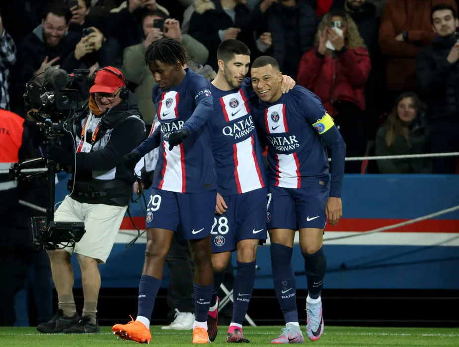 PARIS, FRANCE - MARCH 3: Kylian Mbappe of PSG celebrates scoring his 201st goal for PSG - becoming PSG top scorer in history surpassing Edison Cavani and his 200 goals - with Carlos Soler during the Ligue 1 match between Paris Saint-Germain (PSG) and FC Nantes at Parc des Princes stadium on March 3, 2023 in Paris, France. (Photo by Jean Catuffe/Getty Images)