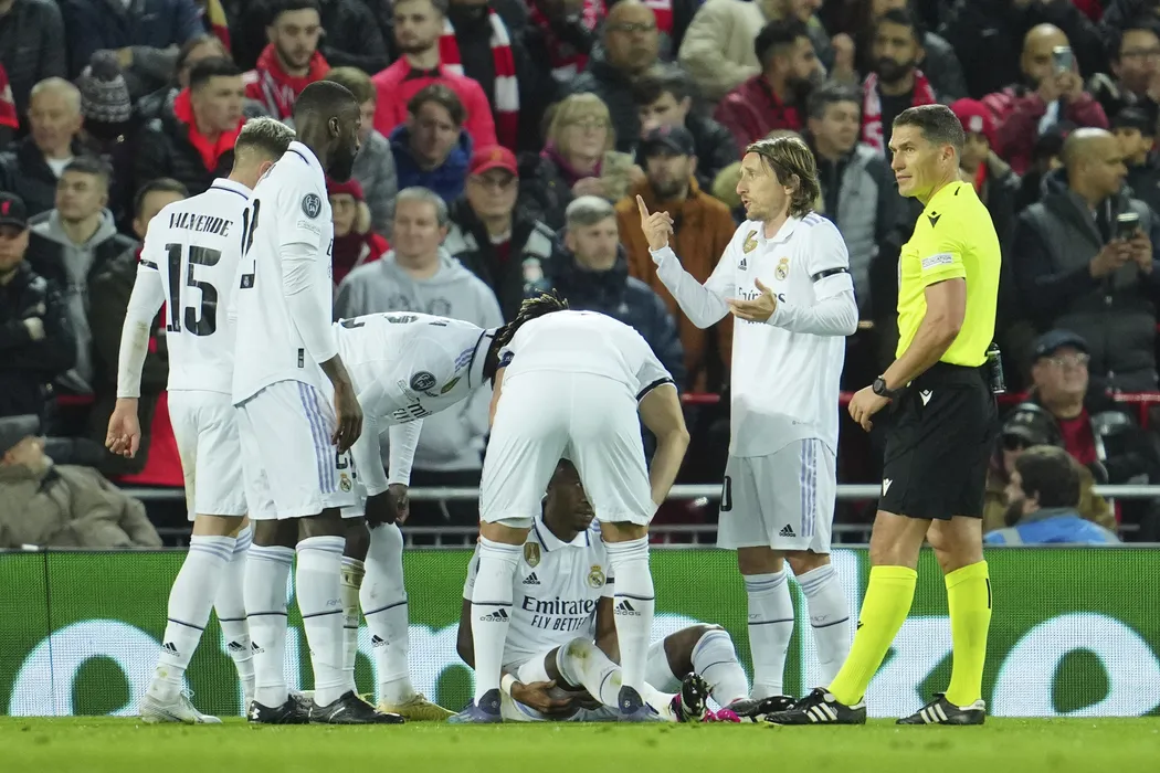 Real Madrid's David Alaba sits on the ground after he was injured during the Champions League, round of 16, first leg soccer match between Liverpool and Real Madrid at the Anfield stadium in Liverpool, England, Tuesday, Feb. 21, 2023. (AP Photo/Jon Super)
