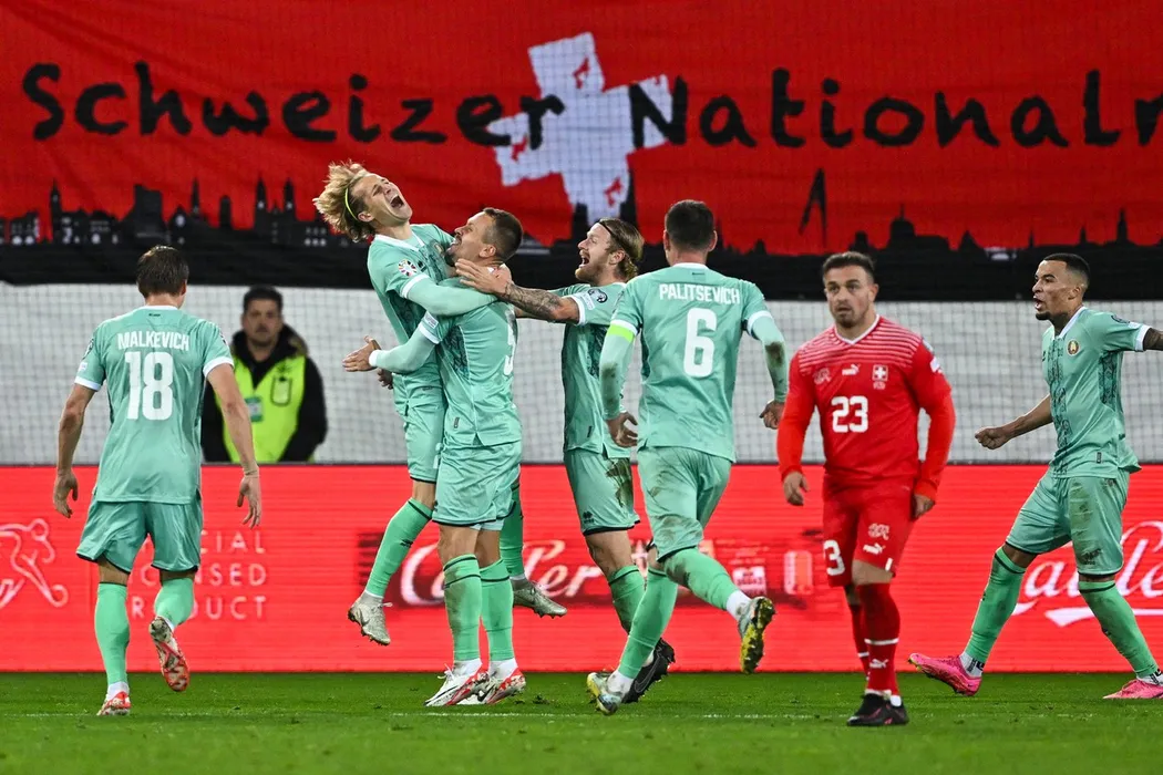 Belarus' players celebrates after scoring their team's second goal as Switzerland's midfielder #23 Xherdan Shaqiri (2-R) reacts during the UEFA Euro 2024 football tournament Group I qualifier match between Switzerland and Belarus at Kybunpark stadium in St. Gallen, on October 15, 2023.,Image: 813937734, License: Rights-managed, Restrictions: , Model Release: no