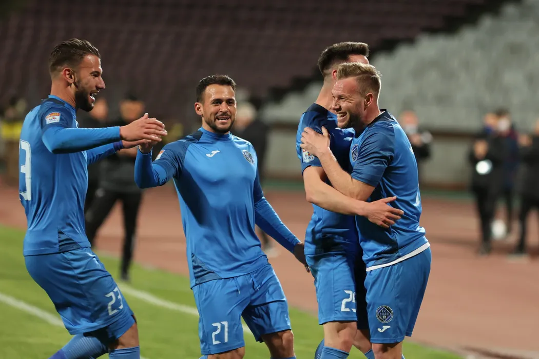 Thibault Moulin (C) de la Academica Clinceni (echipament albastru) isi manifesta bucuria dupa ce a inscris in partida cu Dinamo, partida disputata in etapa 30 din Liga 1 la fotbal, in Bucuresti, vineri 9 aprilie 2021. GEORGE FLUSTER /MEDIAFAX FOTO