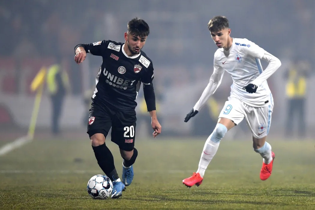 Alexandru Bordusanu (S), de la Dinamo, lupta pentru balon cu Octavian Popescu (D), de la FCSB, in meciul de fotbal din etapa a XXIII-a a Ligii 1, disputat pe stadionul Dinamo din Bucuresti, duminica, 30 ianuarie 2022. ALEX NICODIM / MEDIAFAX FOTO