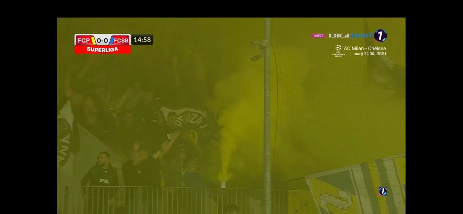 Meciul dintre Petrolul Ploiești și FCSB a fost întrerupt! Suporterii prahoveni rugați „să se comporte civilizat” după ce au aruncat materiale pirotehnice pe teren