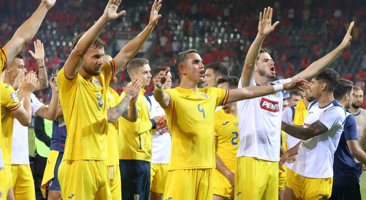 Fotbalistii romani George Puşcaş, Cristian Manea,Tudor Băluţă si Florinel Coman saluta galeria dupa meciul de fotbal dintre Elvetia si Romania, contand pentru Preliminariile Campionatului European, desfasurat pe Luzern Arena din Lucerna, luni 19 iunie 2023.© FOTO SPORT PICTURES