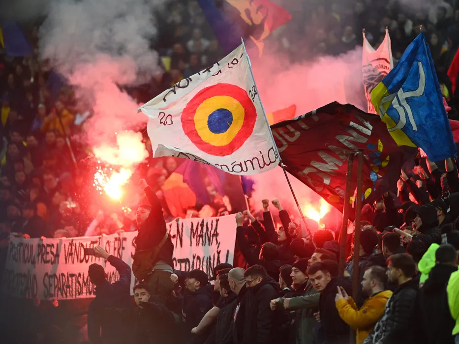 Torte si fumigene in peluza la meciul de fotbal dintre Romania si Belarus, din cadrul preliminariilor Campionatului European 2024, desfasurat pe Arena Nationala, marti 28 martie 2023. © FOTO:Razvan Pasarica/SPORT PICTURES