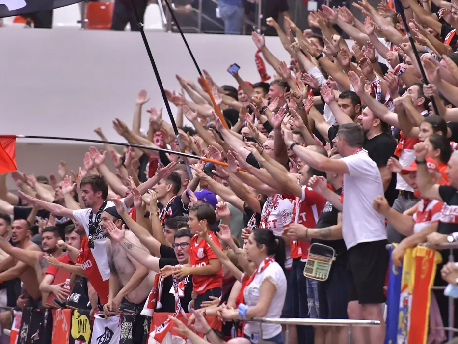 Suporterii dinamovisti isi incurajeaza favoritii la meciul de handbal masculin dintre Dinamo Bucuresti si Lomza Vive Kielce, contand pentru Liga Campionilor, desfasurat in Sala Dinamo din Bucuresti, joi 16 septembrie 2021. © FOTO:Razvan Pasarica/SPORT PICTURES