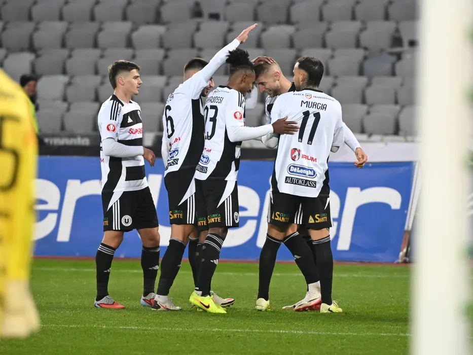 Bucurie a fotbalistilor clujeni Gabriel Bogdan Simion, Lucian Iulian Cristea, Elio Capradossi, Jovo Lukic si Alessandro Murgia dupa un gol marcat în meciul de fotbal dintre Universitatea Cluj si FC Hermannstadt, contând pentru Superliga Superbet, desfășurat pe Cluj Arena din Cluj Napoca, duminica 7 decembrie 2025. © FOTO:Răzvan Pasarica/SPORT PICTURES