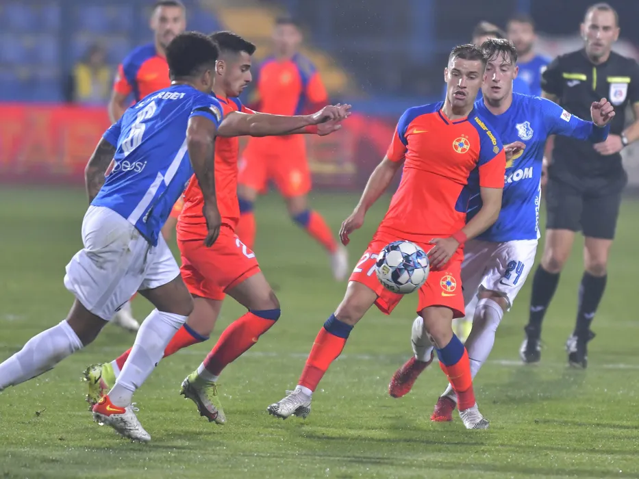 Darius Dumitru Olaru si Constantin Grameni in meciul de fotbal dintre Farul Constanta si FCSB, contand pentru Liga 1 Casa Pariurilor, desfasurat pe Stadionul central al Academiei Gheorghe Hagi din Ovidiu, joi 4 noiembrie 2021. © FOTO:Razvan Pasarica/SPORT PICTURES