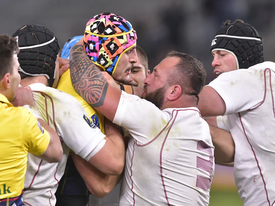 Adrian Moțoc intr-o incaierare cu rugbystii georgieni in meciul de rugby dintre Romania si Georgia, din cadrul Rugby Europe Championship, desfasurat pe Stadionul National Arcul de Triumf din Bucuresti, sambata 12 martie 2022. © FOTO:Razvan Pasarica/SPORT PICTURES