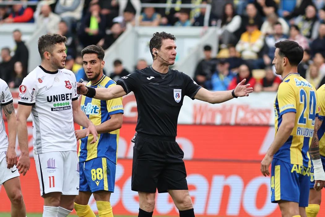 Arbitrul central Horia Gabriel Mladinovici intervine intre Sergiu Florin Bus si Miranda Ricardo Jose Veiga Varzim in meciul de fotbal dintre FC Petrolul Ploiesti si AFC Hermannstadt Sibiu, contand pentru Superliga Superbet Play-Out, desfasurat pe Stadionul Ilie Oana din Ploiesti, duminica 19 aprilie 2026. © FOTO:Gheroghe Fluster/SPORT PICTURES