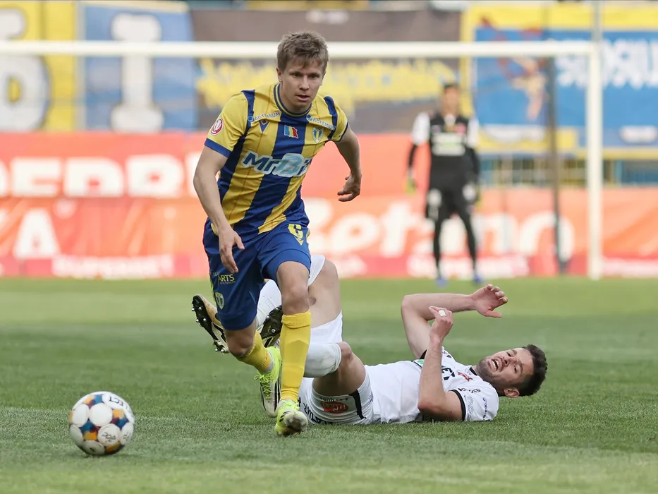 Tommi Matti Jyry si Sergiu Florin Bus in meciul de fotbal dintre FC Petrolul Ploiesti si AFC Hermannstadt Sibiu, contand pentru Superliga Superbet Play-Out, desfasurat pe Stadionul Ilie Oana din Ploiesti, duminica 19 aprilie 2026. © FOTO:Gheroghe Fluster/SPORT PICTURES