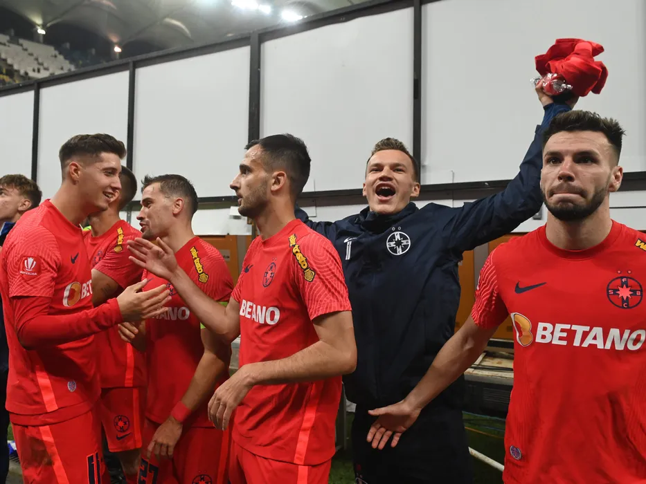 Fotbalistii stelisti David Raul Miculescu, Darius Dumitru Olaru, Boban Nikolov, Grigoras Alexandru Pantea si Andrei Ioan Cordea saluta galeria dupa meciul de fotbal dintre FCSB si Rapid Bucuresti, contand pentru Superliga Superbet, desfasurat pe Arena Nationala din Bucuresti, duminica 6 noiembrie 2022. © FOTO:Razvan Pasarica/SPORT PICTURES