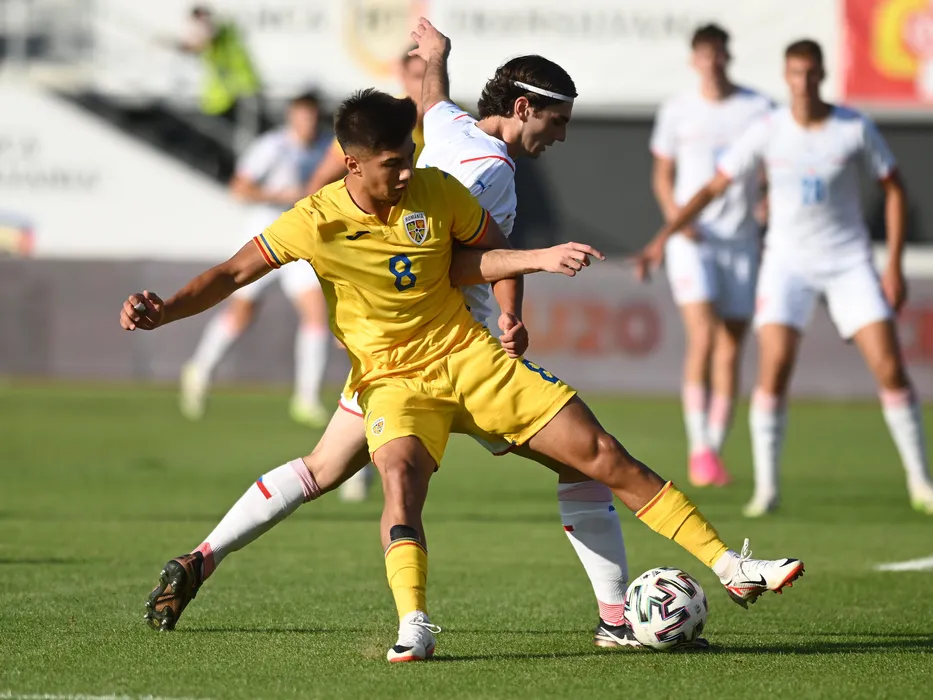 Alexandru Musi si Lucas Kubr in meciul amical de fotbal dintre Romania U20 si Cehia U20, desfasurat pe Stadionul Eugen Popescu din Targoviste, joi 7 septembrie 2023. © FOTO:Razvan Pasarica/SPORT PICTURES