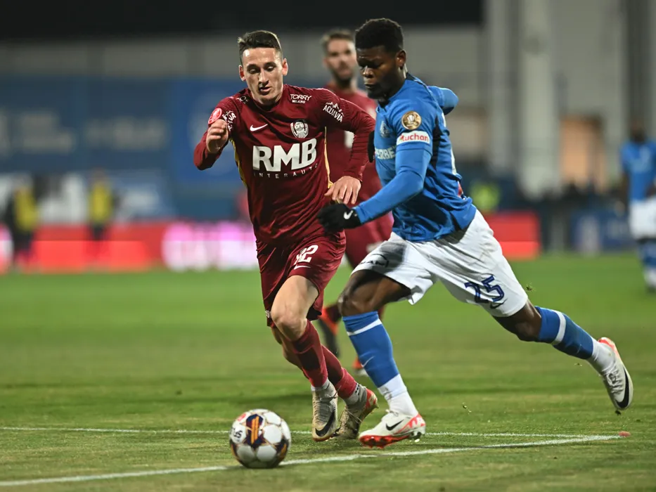 Alin Razvan Fica si David Enagnon Kiki în meciul de fotbal dintre Farul Constanta si CFR Cluj, contând pentru Superliga Superbet, desfășurat pe Stadionul central al Academiei Gheorghe Hagi din Ovidiu, sambata 2 martie 2024. © FOTO: Răzvan PĂSĂRICĂ/SPORT PICTURES