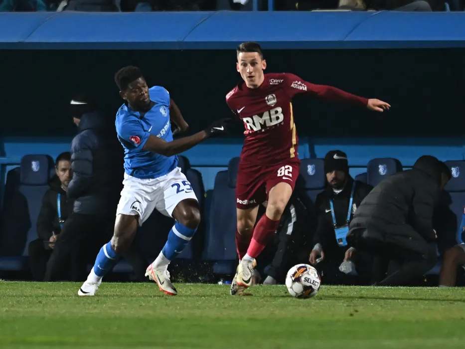 David Enagnon Kiki si Alin Razvan Fica în meciul de fotbal dintre Farul Constanta si CFR Cluj, contând pentru Superliga Superbet, desfășurat pe Stadionul central al Academiei Gheorghe Hagi din Ovidiu, sambata 2 martie 2024. © FOTO: Răzvan PĂSĂRICĂ/SPORT PICTURES