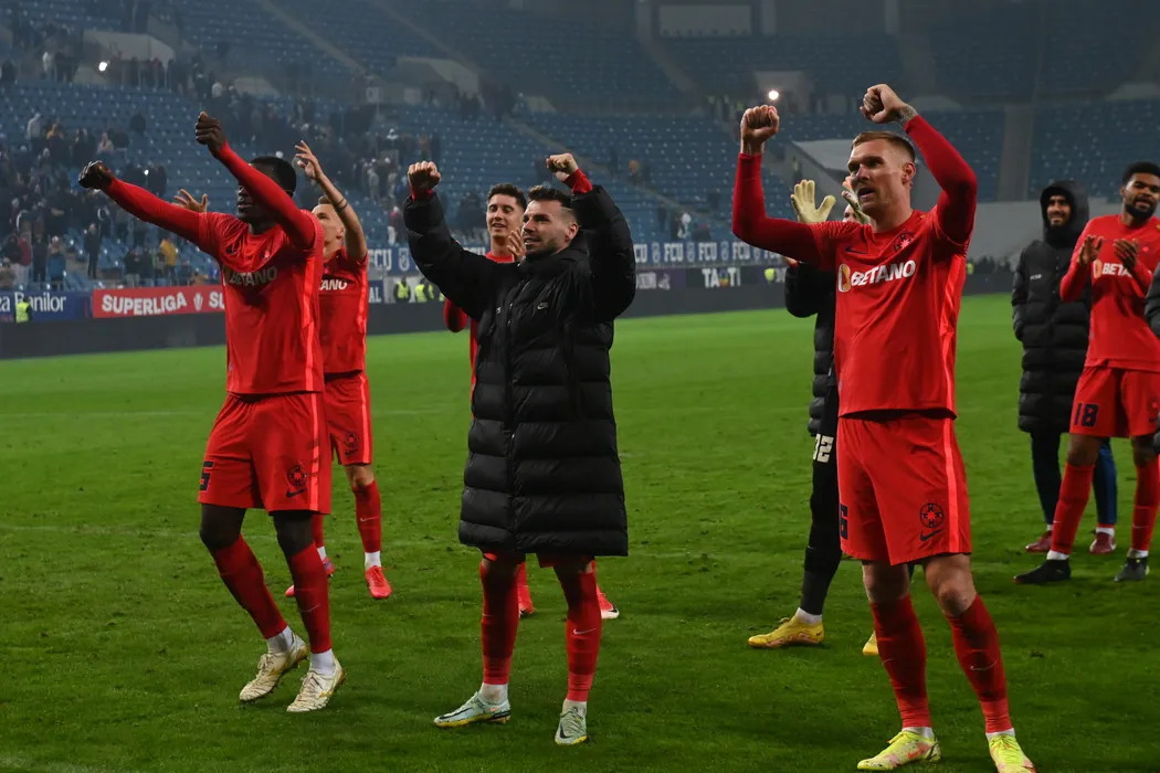 Fotbalistii stelisti Joyskim Aurelien Dawa Tchakonte, Andrei Ioan Cordea si Joonas Tamm saluta galeria dupa meciul de fotbal dintre FC U Craiova si FCSB, contand pentru Superliga Superbet, desfasurat pe Stadionul Ion Oblemenco din Craiova, duminica 13 noiembrie 2022. © FOTO:Razvan Pasarica/SPORT PICTURES