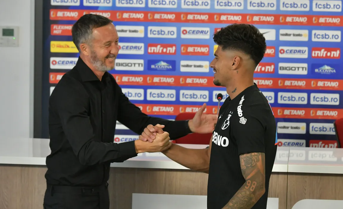Mihai Stoica il saluta pe Florinel Coman la conferinta de presa organizata cu ocazia semnarii parteneriatului FCSB-Betano, desfasurata la Baza de antrenament FCSB din Berceni, vineri 8 iulie 2022. © FOTO:Razvan Pasarica/SPORT PICTURES