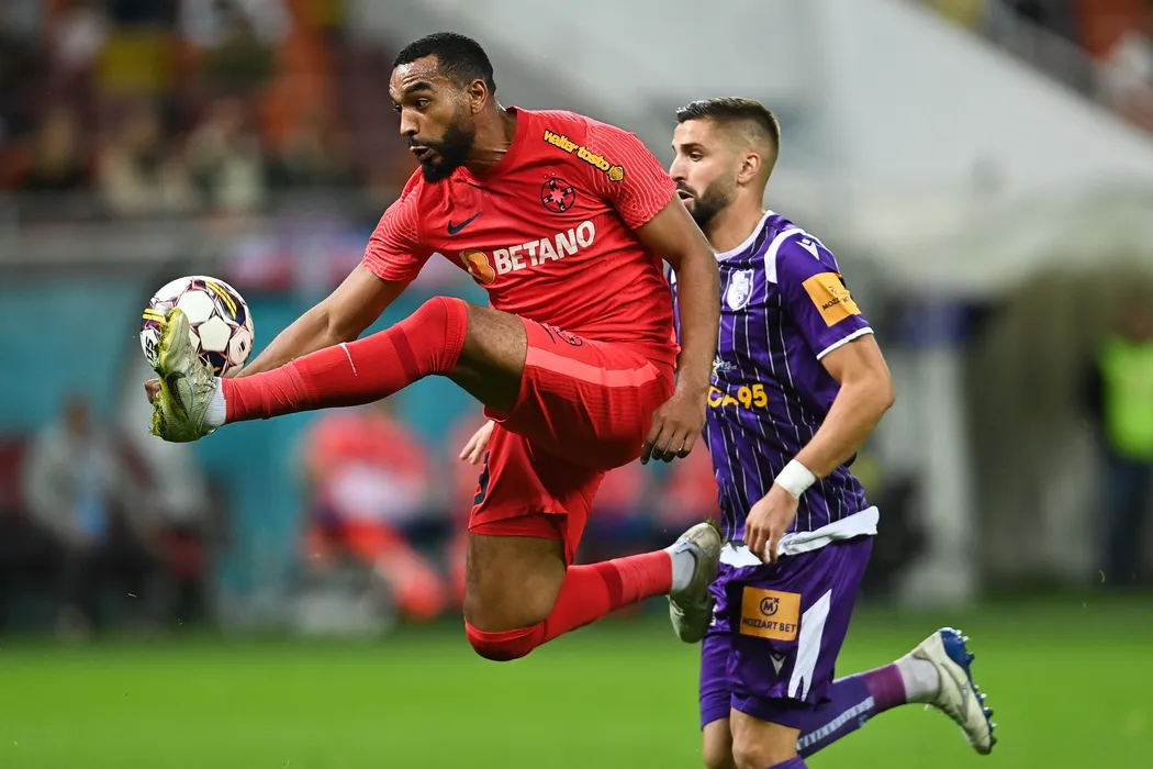 Billel Omrani, de la FCSB, suteaza in timpul meciului de fotbal contra echipei FC Arges din etapa a XII-a a Superligii, disputat pe Arena Nationala din Bucuresti, duminica, 2 octombrie 2022. EDUARD VINATORU / MEDIAFAX FOTO