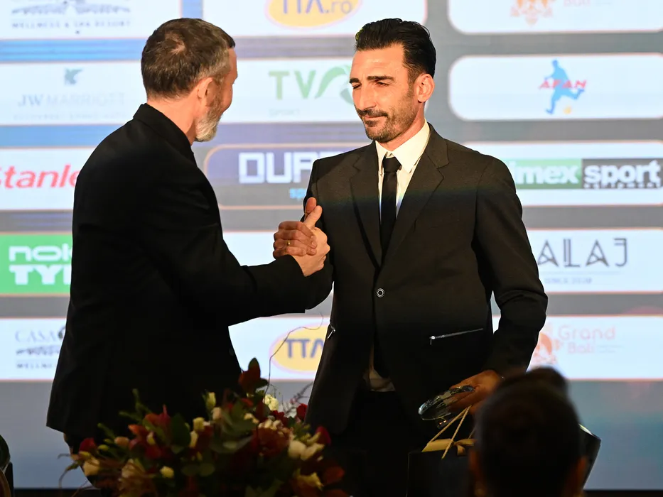 Elias Charalambous, aici felicitat de catre Mihai Stoica, premiat la gala AFAN, desfasurata la Hotelul Marriott din Bucuresti, luni 16 decembrie 2024. © FOTO:Razvan Pasarica/SPORT PICTURES