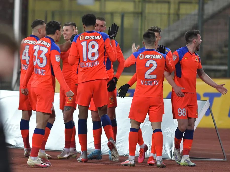 Bucurie a fotbalistilor stelisti dupa un gol marcat de catre Florin Lucian Tanase in meciul de fotbal dintre FC Arges si FCSB, contand pentru Play-off-ul Ligii 1 Casa Pariurilor, desfasurat pe Stadionul Nicolae Dobrin din Pitesti, duminica 20 martie 2022. © FOTO:Razvan Pasarica/SPORT PICTURES