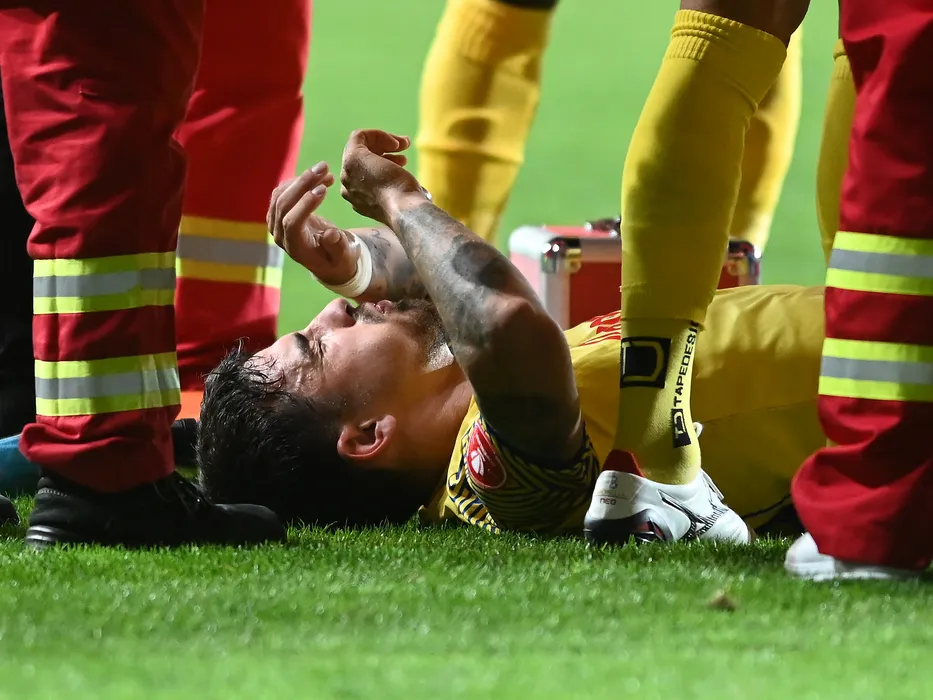 Sergiu Catalin Hanca accidentat in meciul de fotbal dintre Petrolul Ploiesti si FCSB, din cadrul Superligii Superbet, desfasurat pe Stadionul Ilie Oana din Ploiesti, sambata 28 octombrie 2023. © FOTO:Razvan Pasarica/SPORT PICTURES