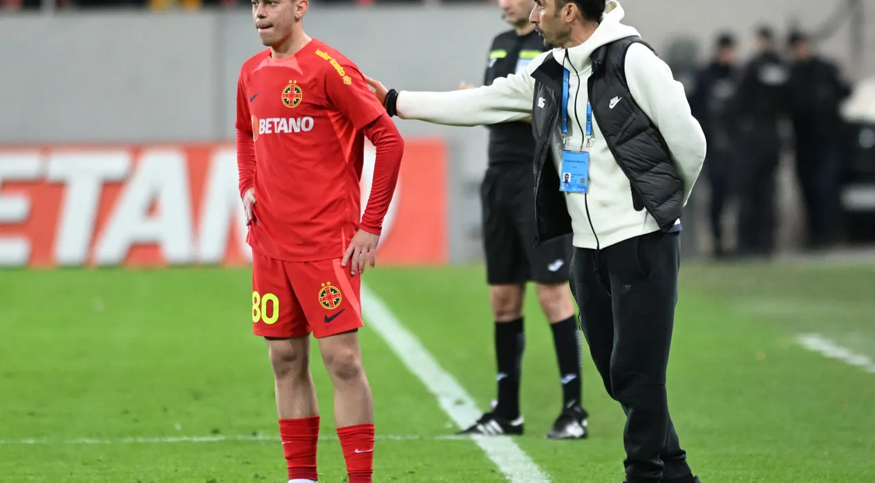 Elias Charalambous il incurajeaza pe Eduard Gabriel Radaslavescu în meciul de fotbal dintre FCSB si Farul Constanta, contând pentru Superliga Superbet, desfășurat pe Arena Nationala din Bucuresti, luni 5 februarie 2024. © FOTO: Răzvan PĂSĂRICĂ/SPORT PICTURES