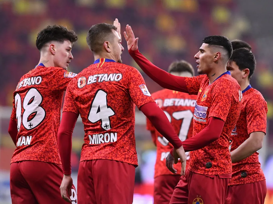 Bucurie a fotbalistilor stelisti dupa un gol marcat cu Dennis Man, Andrei George Miron si Florinel Teodor Coman in meciul de fotbal dintre FCSB si Astra Giurgiu, contand pentru Liga 1 Casa Pariurilor, desfasurat fara spectatori pe Arena Nationala din Bucuresti, vineri 15 ianuarie 2021. © FOTO:Razvan Pasarica/SPORT PICTURES