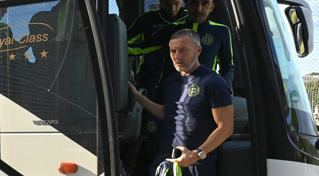 Mihai Stoica coboara din autocar la antrenamentul oficial de dinaintea meciului impotriva lui FC Nordsjælland, din cadrul UEFA Europa Conference League, desfasurat pe Right to Dream Park din Farum, miercuri 16 august 2023. © FOTO:Razvan Pasarica/SPORT PICTURES