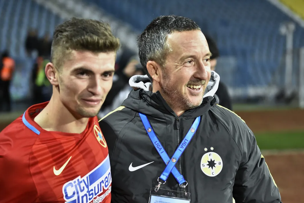 Mihai Stoica (D), directorul sportiv al echipei FCSB, il felicita pe jucatorul Florin Tanase (S) la finalul meciului de fotbal contra formatiei CS U Craiova din etapa a XVI-a a Ligii 1, disputat pe stadionul Municipal din Drobeta Turnu-Severin, duminica, 29 octombrie 2017. JUSTINEL STAVARU / MEDIAFAX FOTO