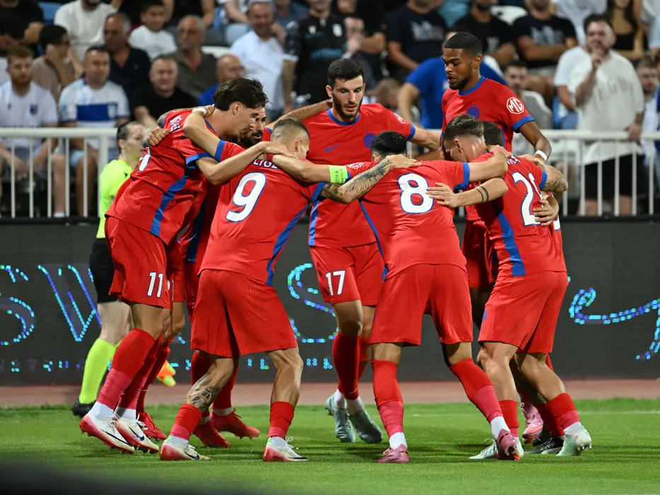 Hora a bucuriei ros albastre cu David Raul Miculescu, George Daniel Bîrligea, Mihai Popescu si Malcolm Edjouma dupa un gol marcat in meciul de fotbal dintre FC Drita Gjilan si FCSB, din cadrul UEFA Europa League, desfasurat pe Stadionul Fadil Vokrri din Pristina, joi 14 august 2025. © FOTO:Razvan Pasarica/SPORT PICTURES